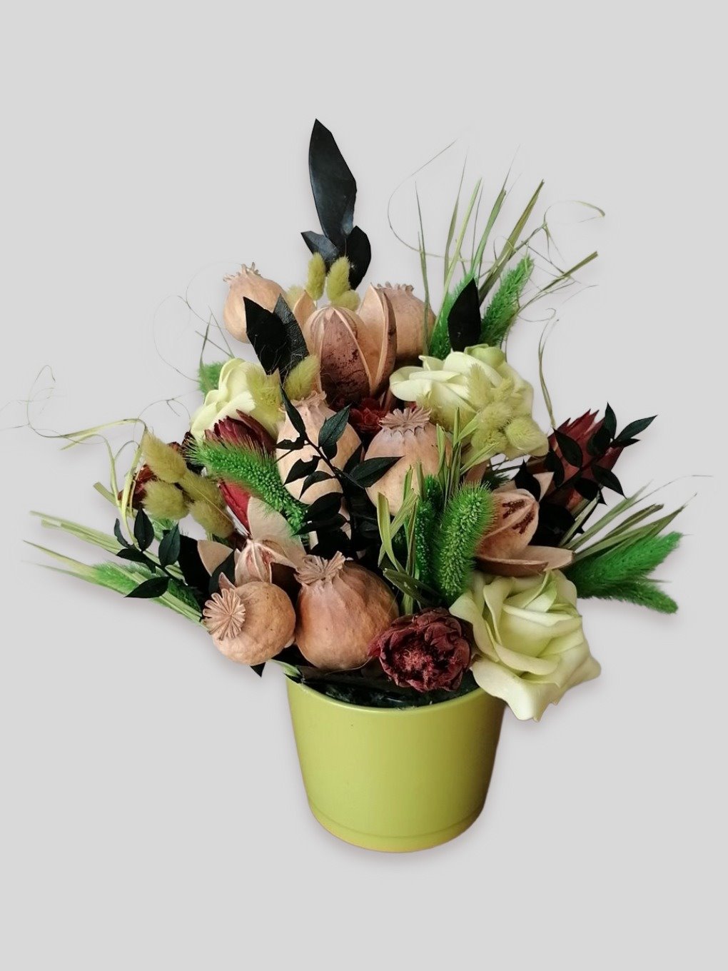 Kezdőlap / Asztaldíszek / Mákgubós asztaldísz a zöld árnyalataiban