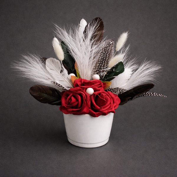 Kezdőlap / Asztaldíszek / Tollas asztaldísz rózsával