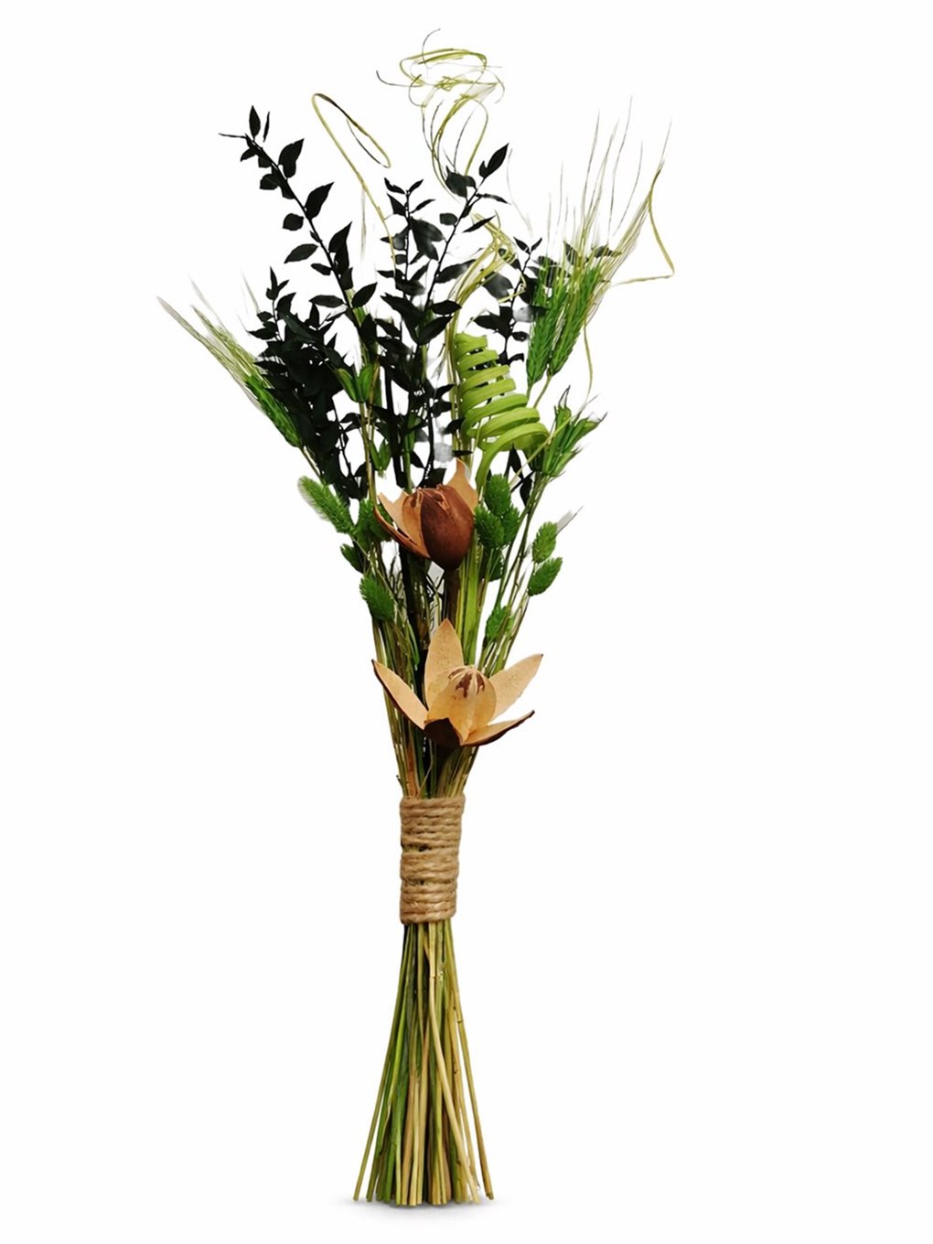 - Természetes hatású, kézzel kötött szárazvirág csokor friss zöld árnyalatokkal